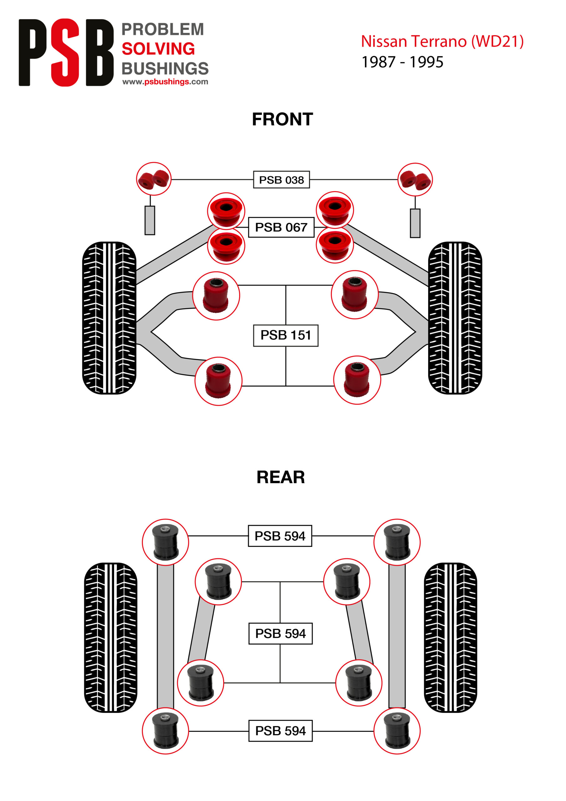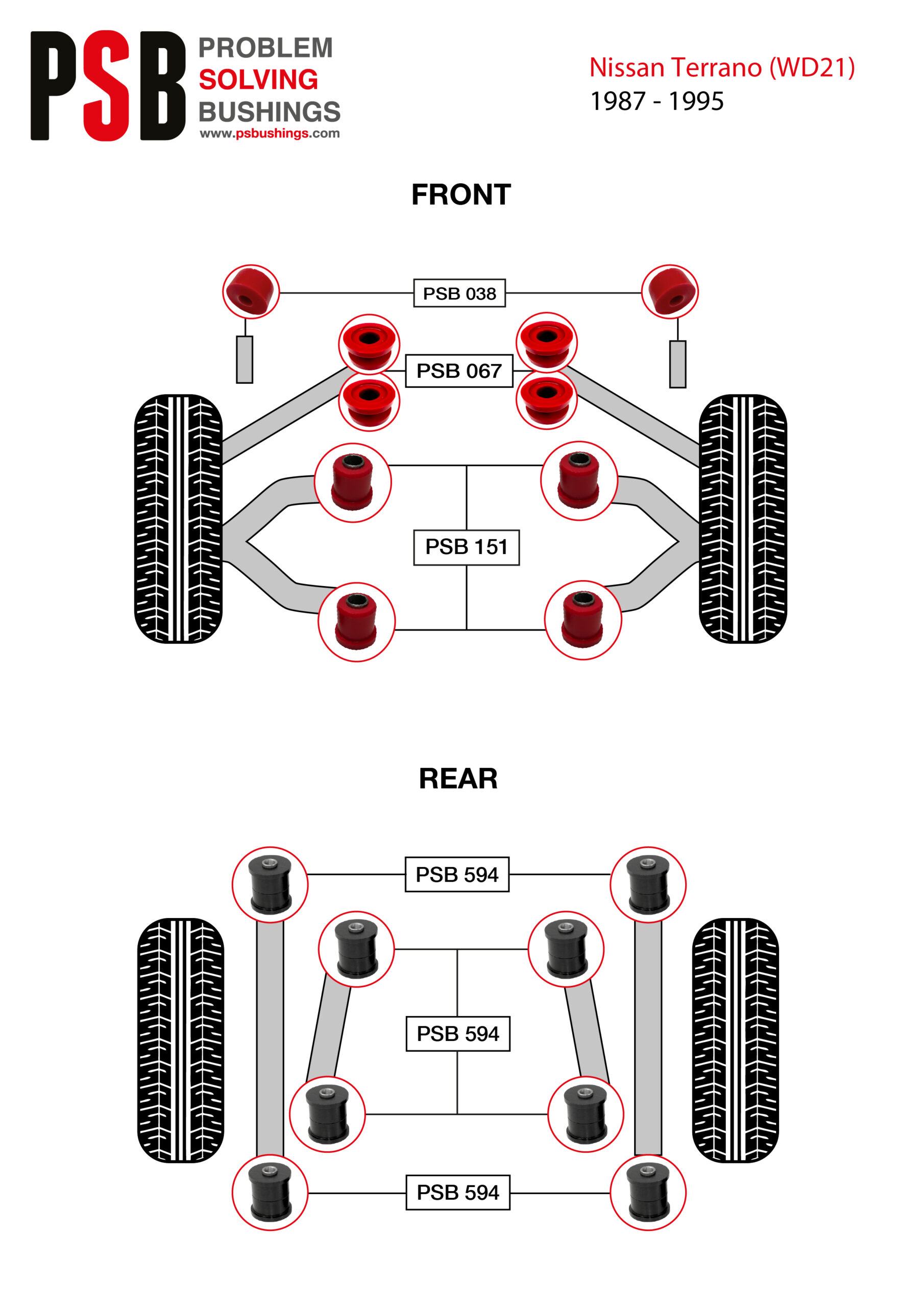 • 18x Nissan Terrano WD21 (87-95) Rear Upper/ Lower Arm, Front Upper Arm, Shock Bush & Tension Rod PSB Polyurethane Bushing Kit