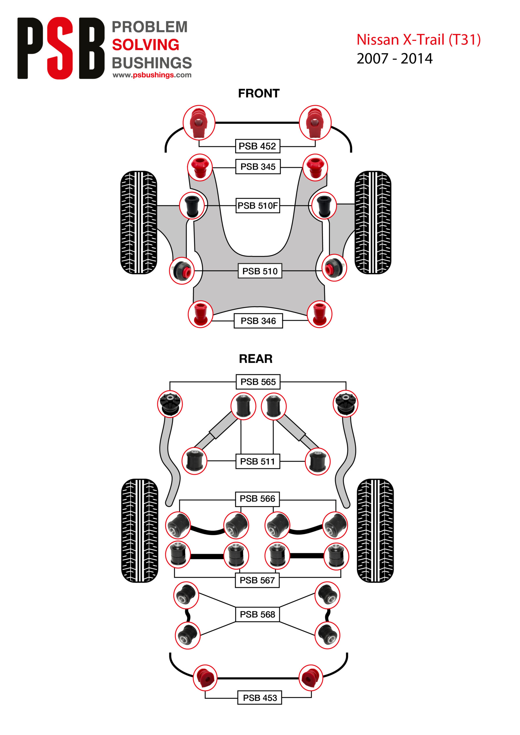 • Nissan X-Trail T31/T32 (07-17) Complete Rear Suspension Poly Bush Kit – PSB453/511/565/566/567/568
